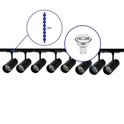 Complete Set 1-Fase Rail 3 Meter Zwart | incl. 8x Spot + GU10 2700K 3W Dimbaar + Eindkap, Voedingsconnector en I-Verbindingsstuk