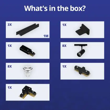 | Fabrikantnaam | Complete L shaped 1-Phase Track Set Black incl. 8x Spot fixture + GU10 2700K 3W Dim – 1 x 2 meter i | |