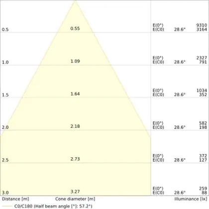 De gradenbundel geeft informatie over hoe breed het licht wordt uitgestraald. Dit zit tussen de 0 en 360 graden (D). Hoe kleiner de hoek, hoe specifieker de lichtbundel is. Over het algemeen is een smalle gradenbundel perfect voor sfeer- of accentverlichting, terwijl een brede gradenbundel ideaal is om grote oppervlaktes te verlichten.